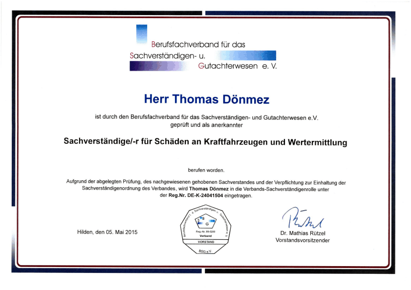 Berufsfachverband – Berufung zum Sachverständiger für Schäden an Kraftfahrzeugen und Wertermittlung