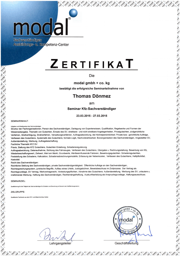 modal Zertifikat Seminar Kfz-Sachverständiger